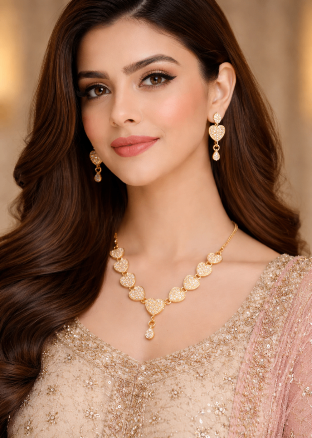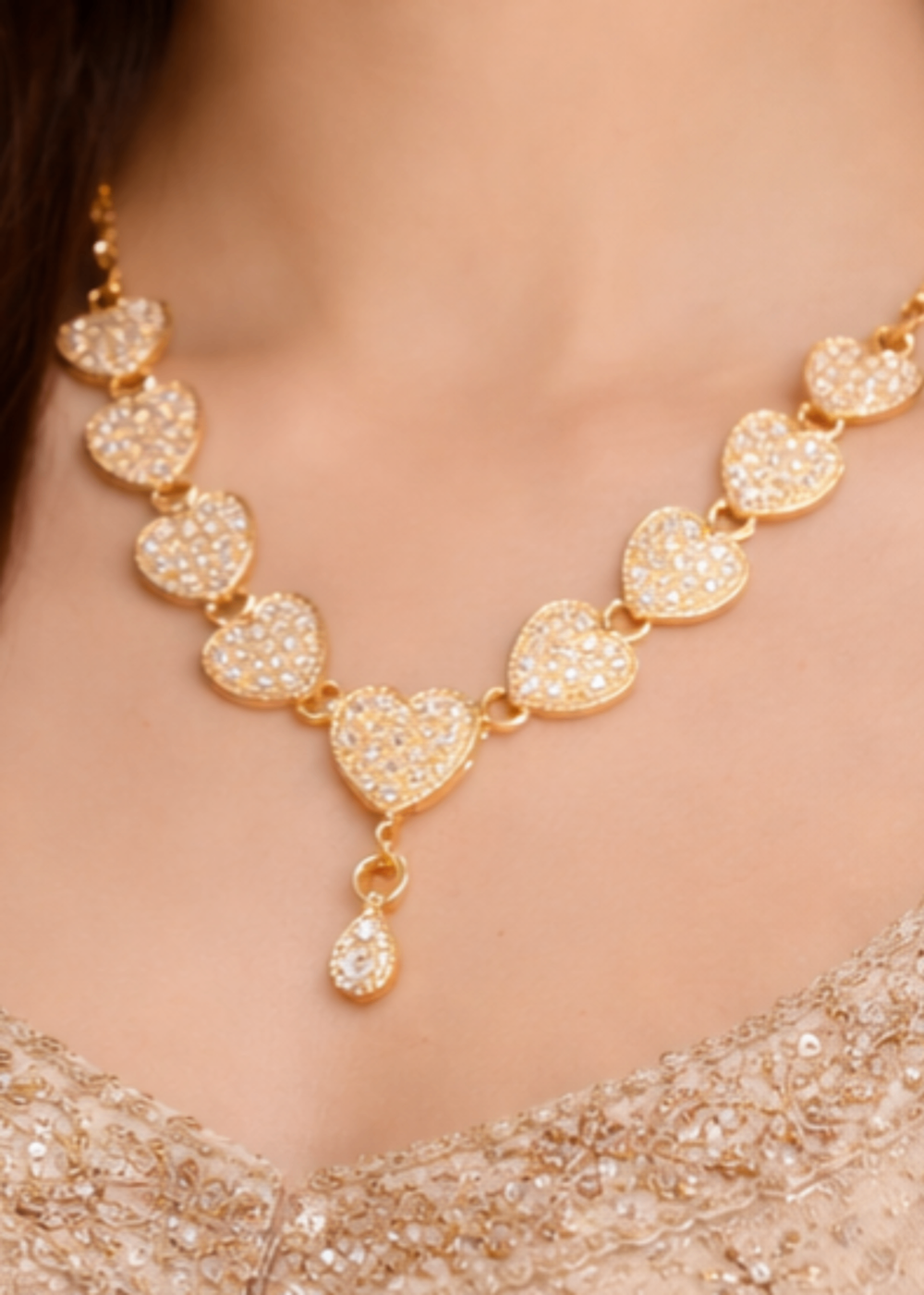 Crafted with multiple sparkling heart-shaped crystal pendants, this necklace creates a graceful and romantic look that enhances any outfit. The delicate gold chain and matching crystal earrings add the perfect balance of sophistication and charm.